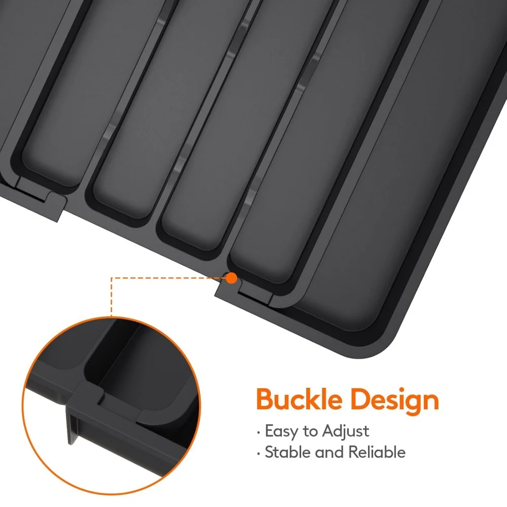 Description: This organizer adjusts to the specific width of a kitchen drawer, ensuring that silverware stays neatly partitioned rather than shifting during opening and closing. It provides a structured home for standard place settings while utilizing the full depth of the storage space. The sliding mechanism allows for a custom fit in various cabinet sizes without needing permanent installation. It features multiple compartments to separate forks, spoons, and knives for efficient retrieval.