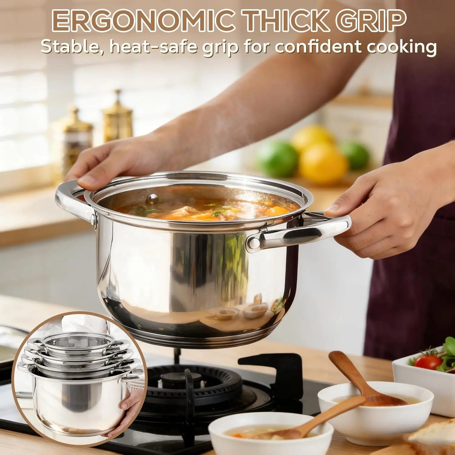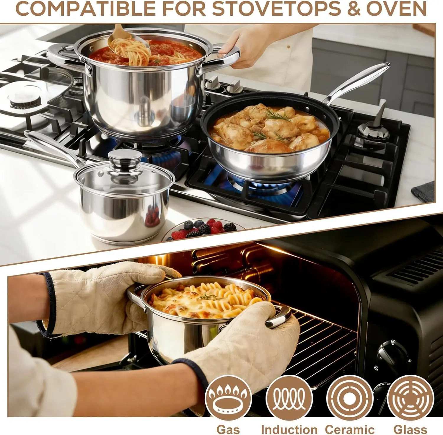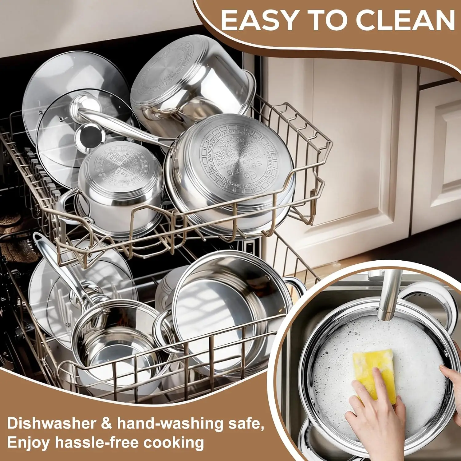 Description: This extensive collection features a variety of stainless steel pots and pans designed to handle a wide range of cooking tasks. The polished metal construction provides a durable surface that resists staining and does not react with acidic foods, maintaining the integrity of your ingredients.