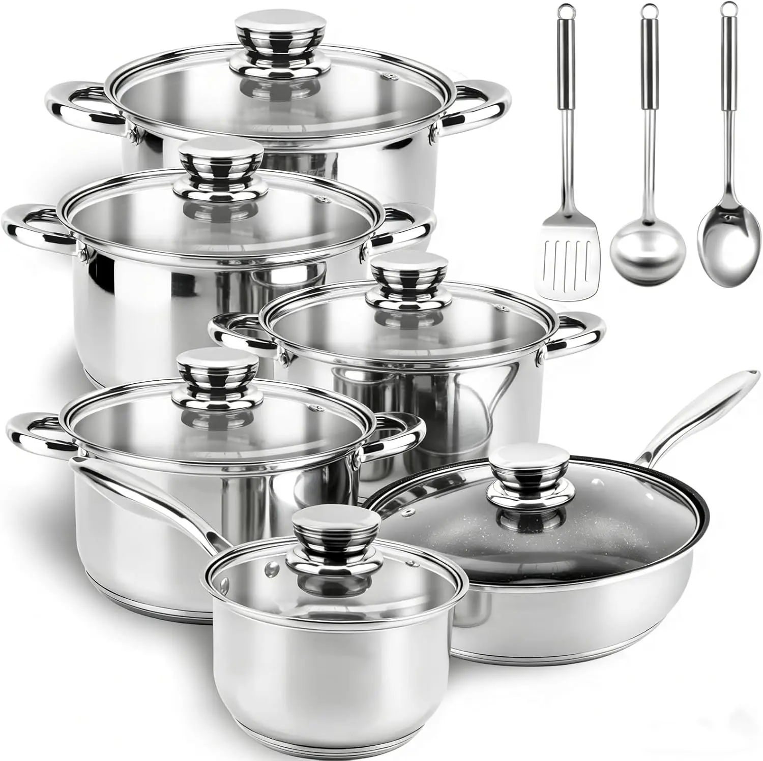 Included components: 3 stockpots with lids, 1 saucepan with lid, 1 frying pan with lid, 1 milk pot with lid, 1 slotted turner, 1 soup ladle, 1 serving spoon